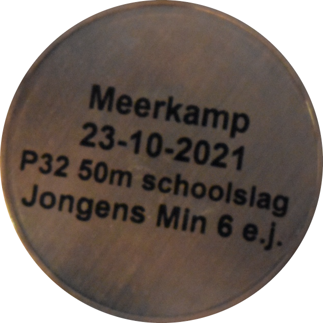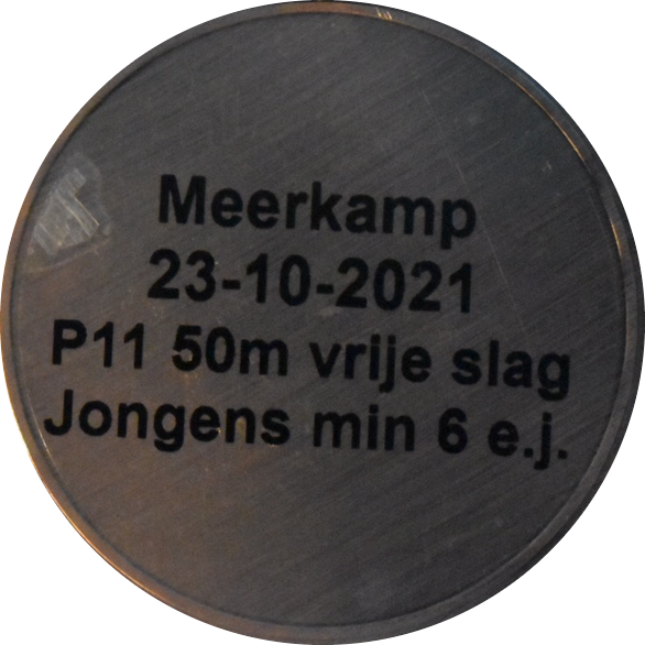 Geplaatst op 23 oktober 202131 oktober 2021Medaille: 50m vrije slag (2x25m): 38.51 Behaald tijdens: Meerkamp deel 1 Klik op de medaille om deze te draaien.